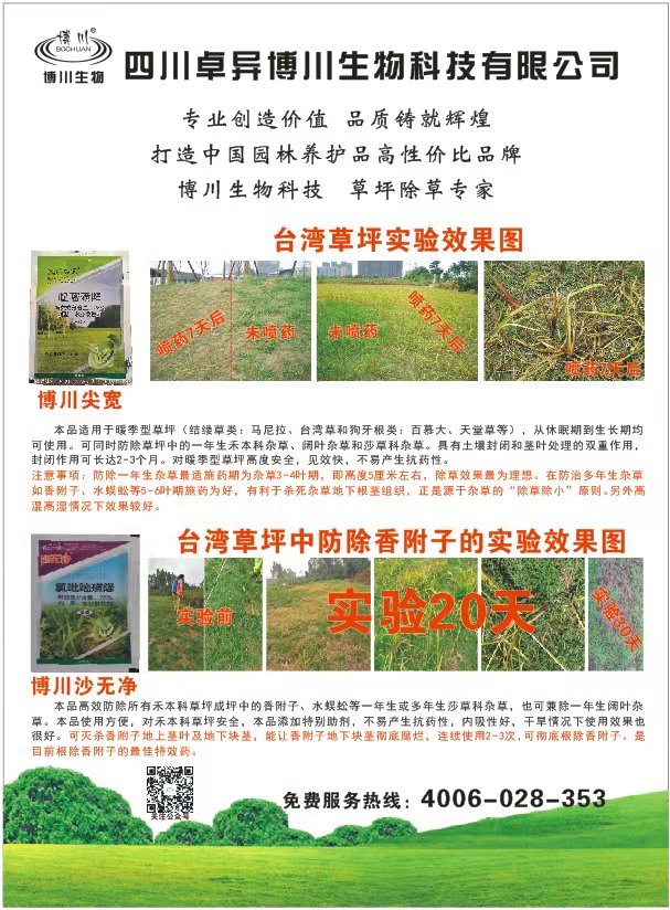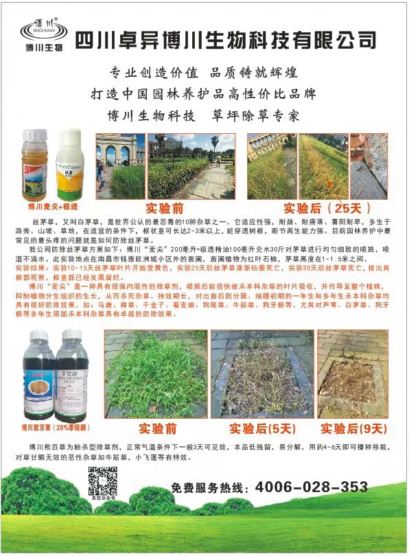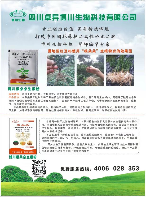 四川卓异博川生物科技有限公司创立于2009年,是一家专业从事园林绿化养护产品的研发和销售的企业,公司位于有“天府之国”之称的四川省成都市,公司以“诚信、务实、创新”为核心价值,以“园林医生”的标准为己任,通过公司全体员工的努力,为广大园林界的朋友提供优质、高效的高性价比园林绿化养护产品,致力于为广大朋友解决园林绿化中的诸多问题,如园林病虫害防治问题,大树移栽养护问题,园林杂草防除问题等等。公司的园林养护产品主要包括草坪专用除草剂;大树移栽生根剂、大树吊针液等大树养护产品;杀虫剂、杀菌剂、肥料等园林养护产品。公司自成立以来,销售网路已经遍布全国各大城市,和许多朋友建立了长期稳定的合作关系,公司以优质规范稳定的产品质量和专业的技术服务赢得了广大用户的认可。