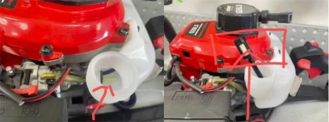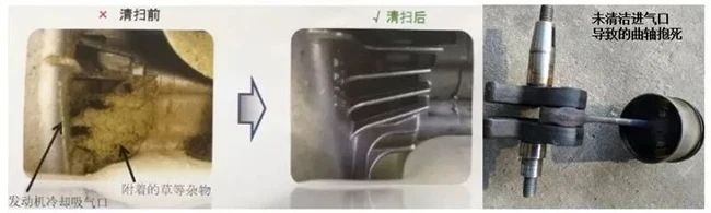 及时清理附着在吸气口的杂物,避免堵塞。吸气口犹如人的呼吸道,一旦堵上轻则窒息,重则报废。每壶油用完后必须把吸气口的碎草等杂物清理干净,确保发动机正常。