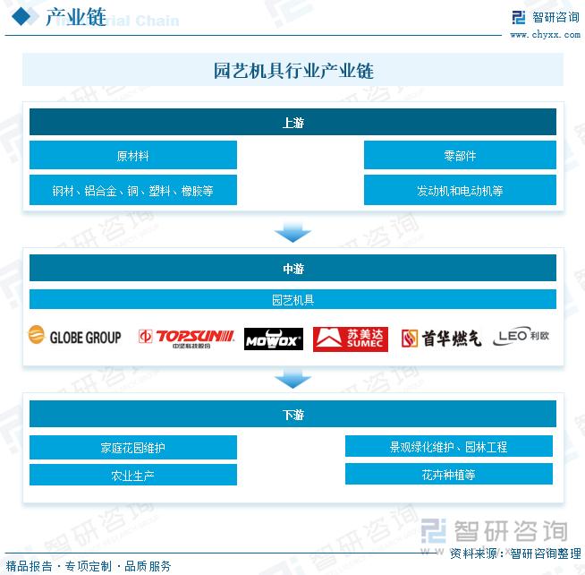 园艺机具行业产业链上游主要包括钢材、铝合金、铜、塑料、橡胶等原材料,以及发动机和电动机等零部件;行业中游为园艺机具的生产制造;行业下游主要应用于家庭花园、景观绿化、园林工程、农业生产、花卉种植等领域。