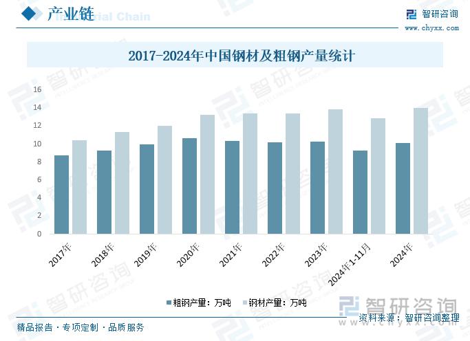 钢铁业是国民经济中的支柱产业。建筑业和制造业作为钢材消费的主要领域,在经济下行及房地产行业需求减弱的背景下,制造业异军突起成为支撑钢材需求的重要动力。2023年,中国粗钢产量为10.29亿吨,同比下增加0.11亿吨;钢材产量为13.84亿吨,同比增长0.43亿吨。2024年的中国钢铁行业在出口、海外建厂、专利创新、人才吸引、产业链延伸、智能化转型、产能压减、钢企重组以及市场需求与产能变化等方面均呈现出积极的发展态势。2024年1-11月,中国粗钢产量为9.29亿吨,同比下降2.7%,钢材产量为12.83亿吨,同比增长0.9%。2024年中国粗钢产量约为10.13亿吨,钢材产量约为14亿吨。